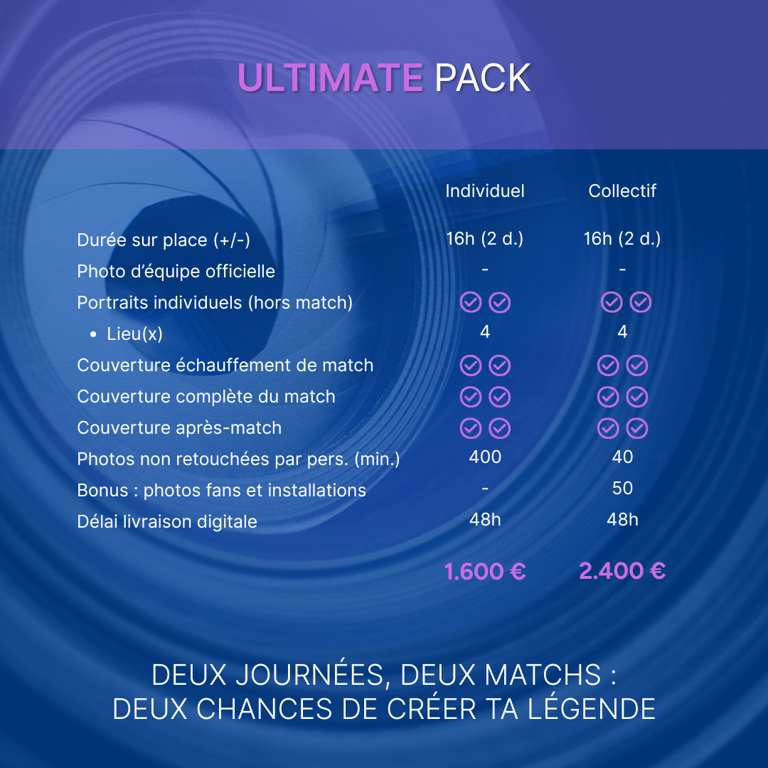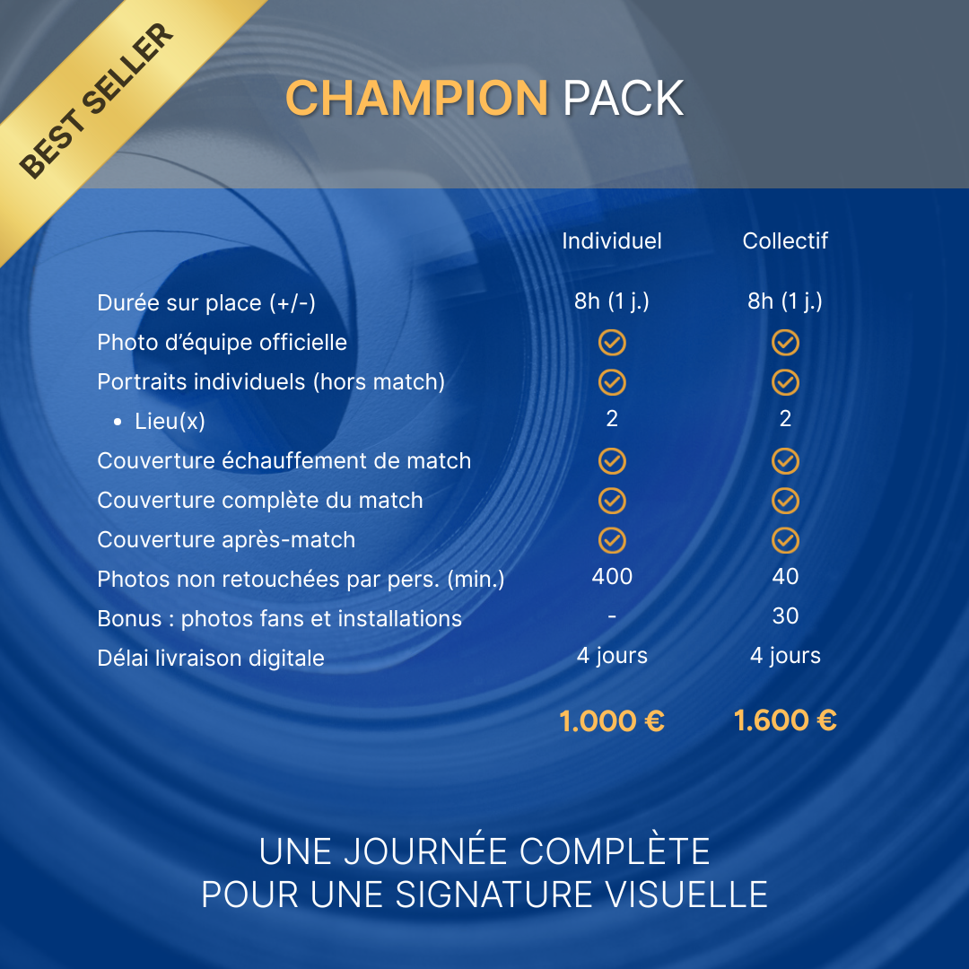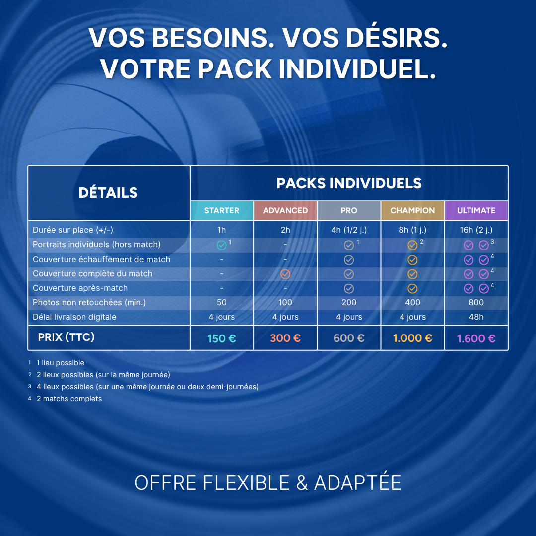 Du focus joueur jusqu’à la journée complète mettant en scène portraits, entraînement, match, coulisses, etc. Des packs pensés pour tous les besoins et budgets.