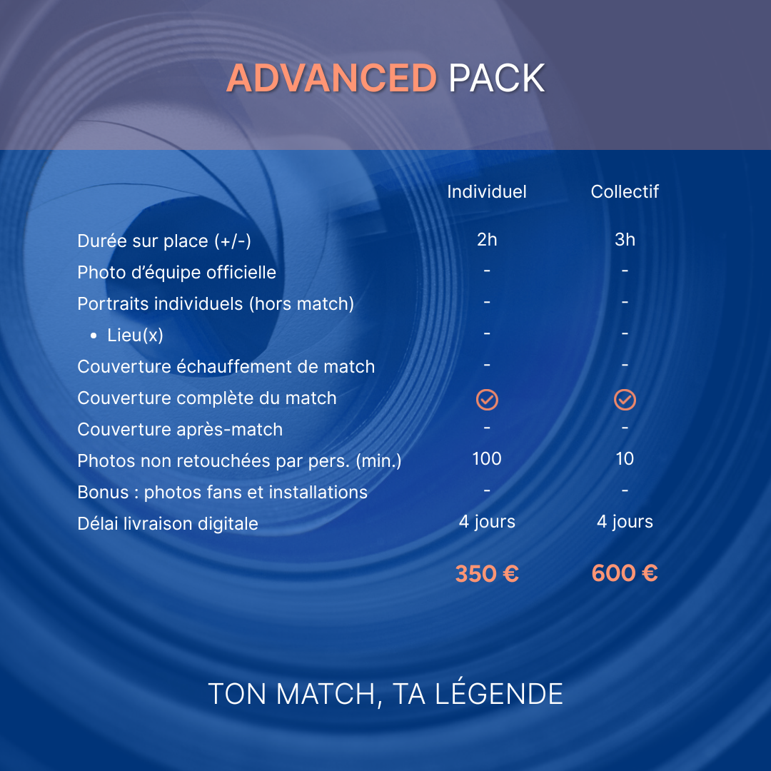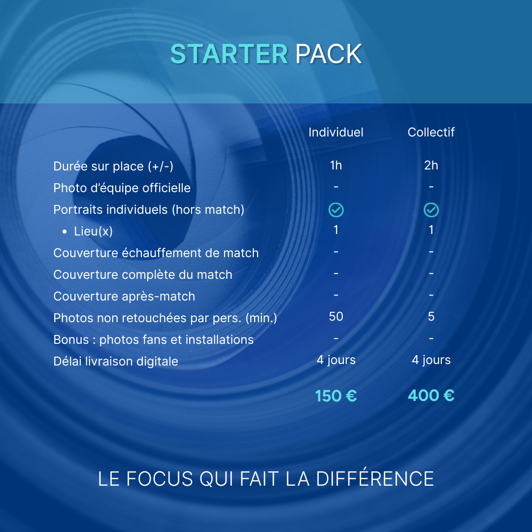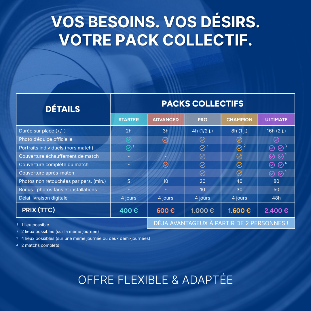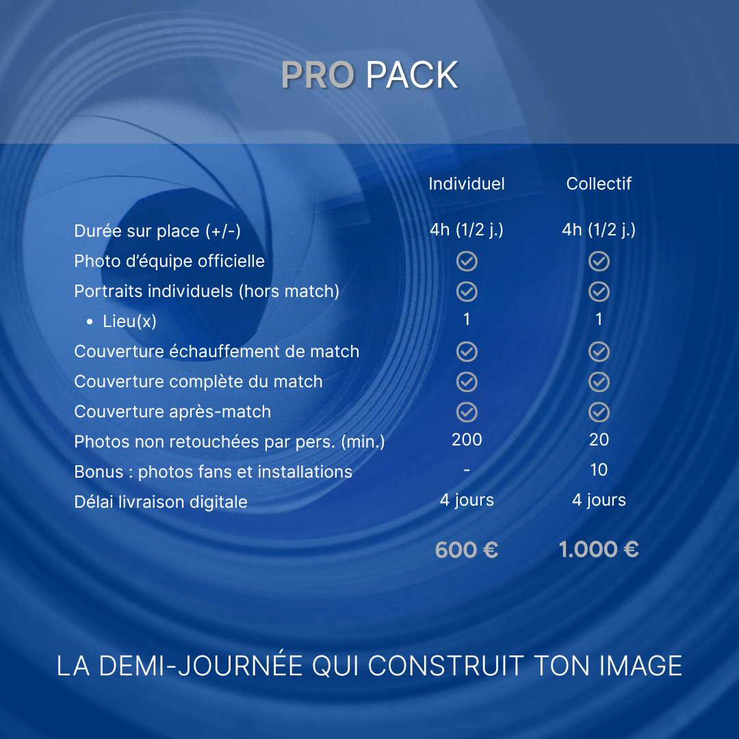 Du focus joueur jusqu’à la journée complète mettant en scène portraits, entraînement, match, coulisses, etc. Des packs pensés pour tous les besoins et budgets.