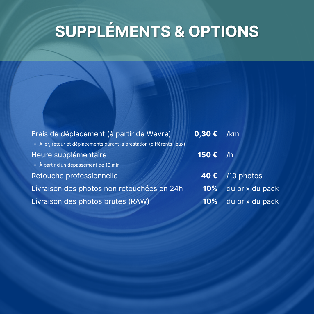 Complétez votre pack selon vos besoins : frais de déplacement, heure supplémentaire, retouches professionnelles avancées, livraison express 24h, et possibilité de recevoir les photos RAW sous licence d’usage restreinte.