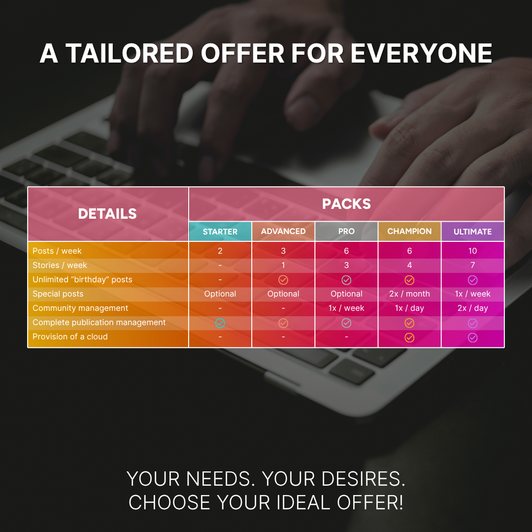 Plusieurs packs disponibles, adaptés à tous les budgets et à toutes les ambitions.