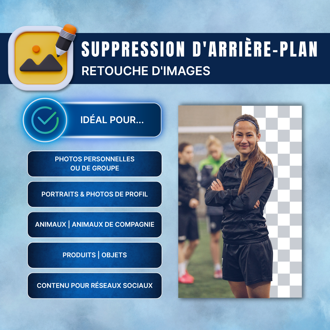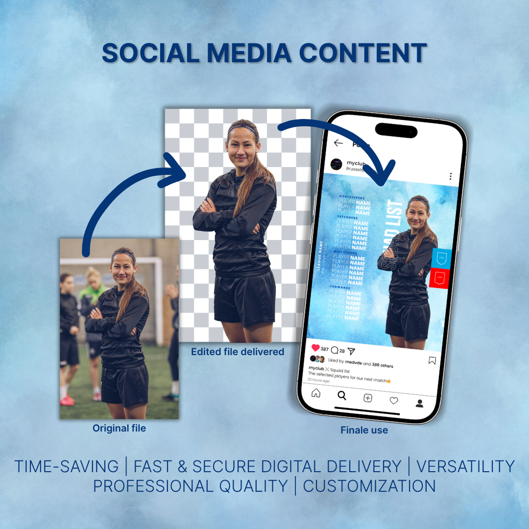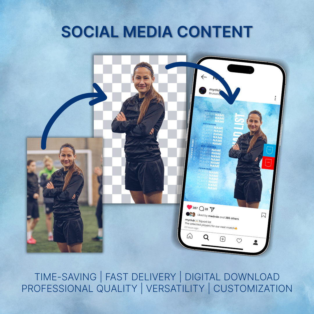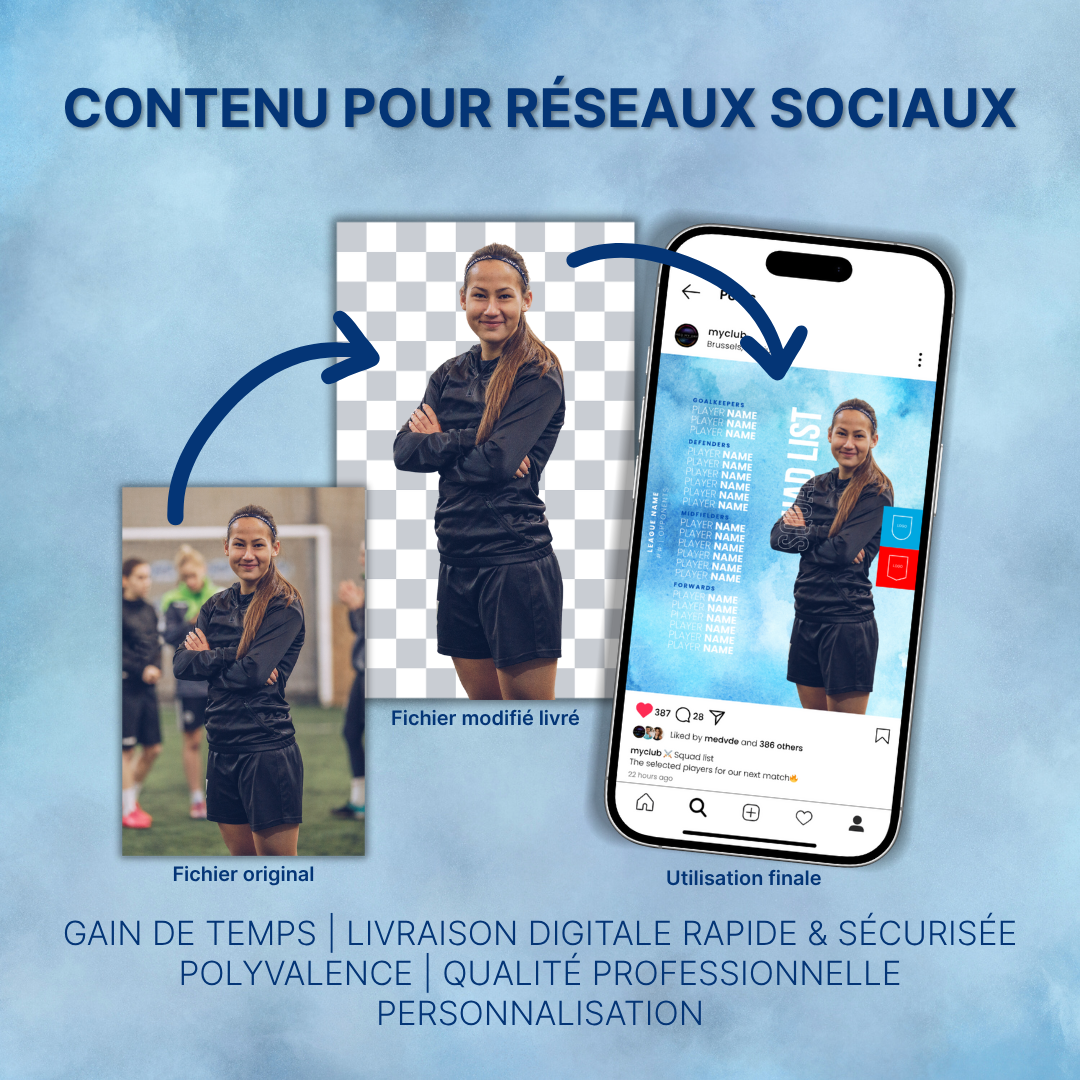 Que vous soyez créateur, club sportif ou entreprise, vos posts se démarqueront avec des visuels soignés, optimisés pour Instagram, Facebook, ou d'autres réseaux sociaux. L’arrière-plan supprimé ou personnalisé rend chaque publication plus attractive et professionnelle.