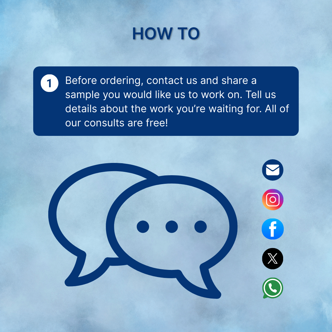 Svp, veuillez envoyer tous vos fichiers en un seul mail (par pièces jointes ou par lien de téléchargement), ainsi que votre preuve d’achat.