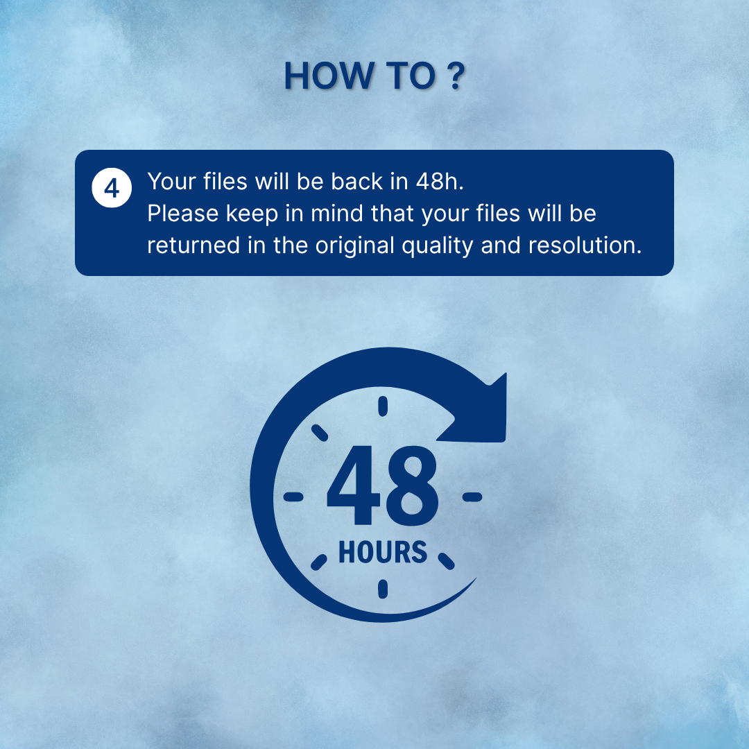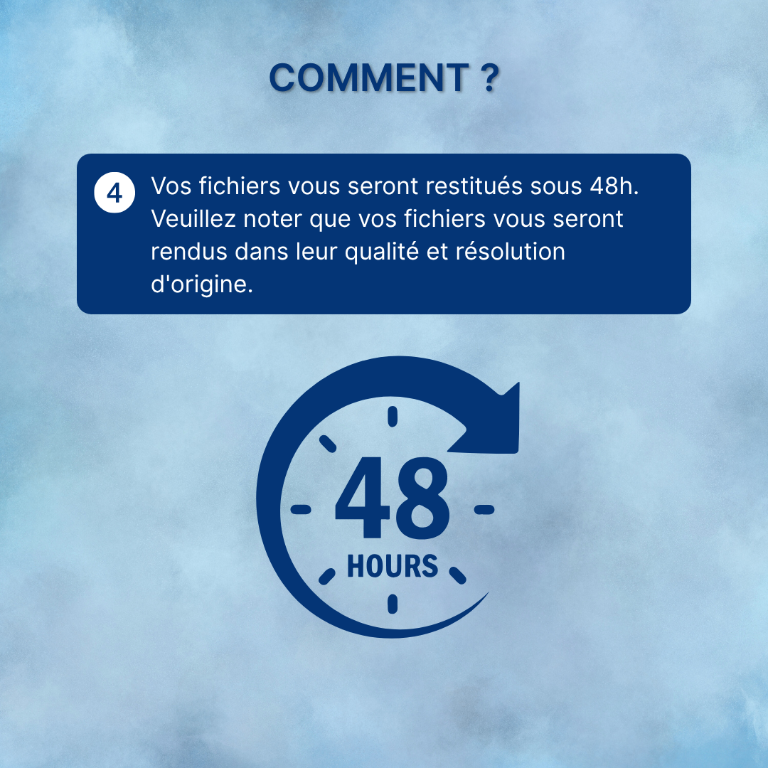- Livraison digitale des images sous 48h ouvrables pour chaque pack, à partir du lendemain de la date de réception des fichiers du client.
