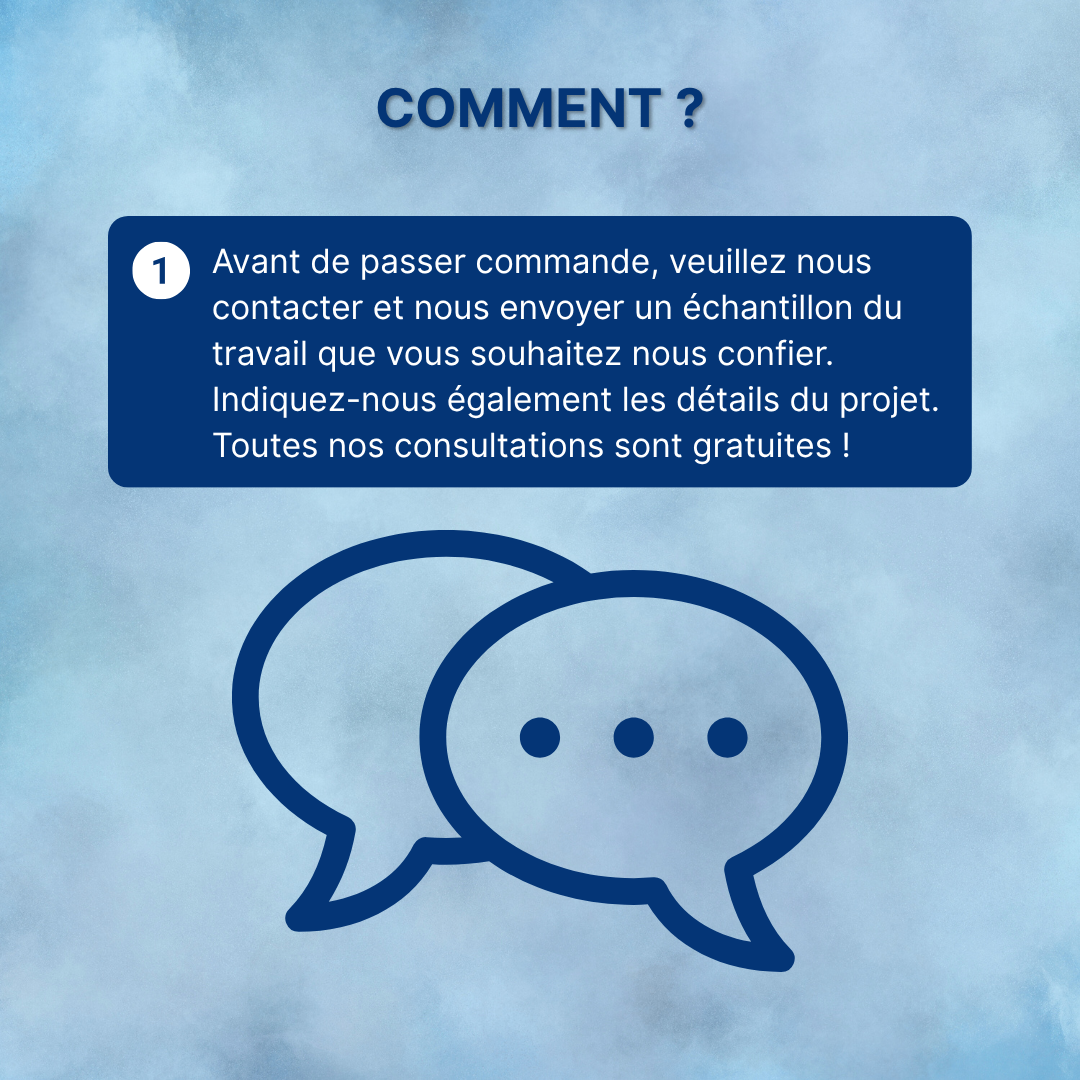 Afin de vous garantir le meilleur résultat, nous vous invitons à nous envoyer un exemple de photo et nous décrire le résultat attendu avant de passer commande.