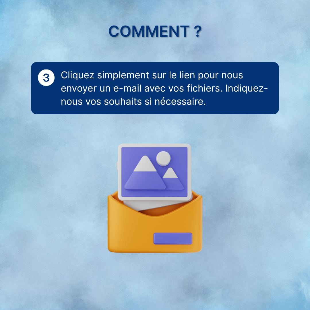 - Le client envoie les images à travailler uniquement via l'adresse mail spécifique wemakeit@medmyday.shop ! Les fichiers peuvent être envoyés en pièces jointes au mail ou via un lien de téléchargement si le poids est trop lourd (WeTransfer, Dropbox, Google Drive, etc.).