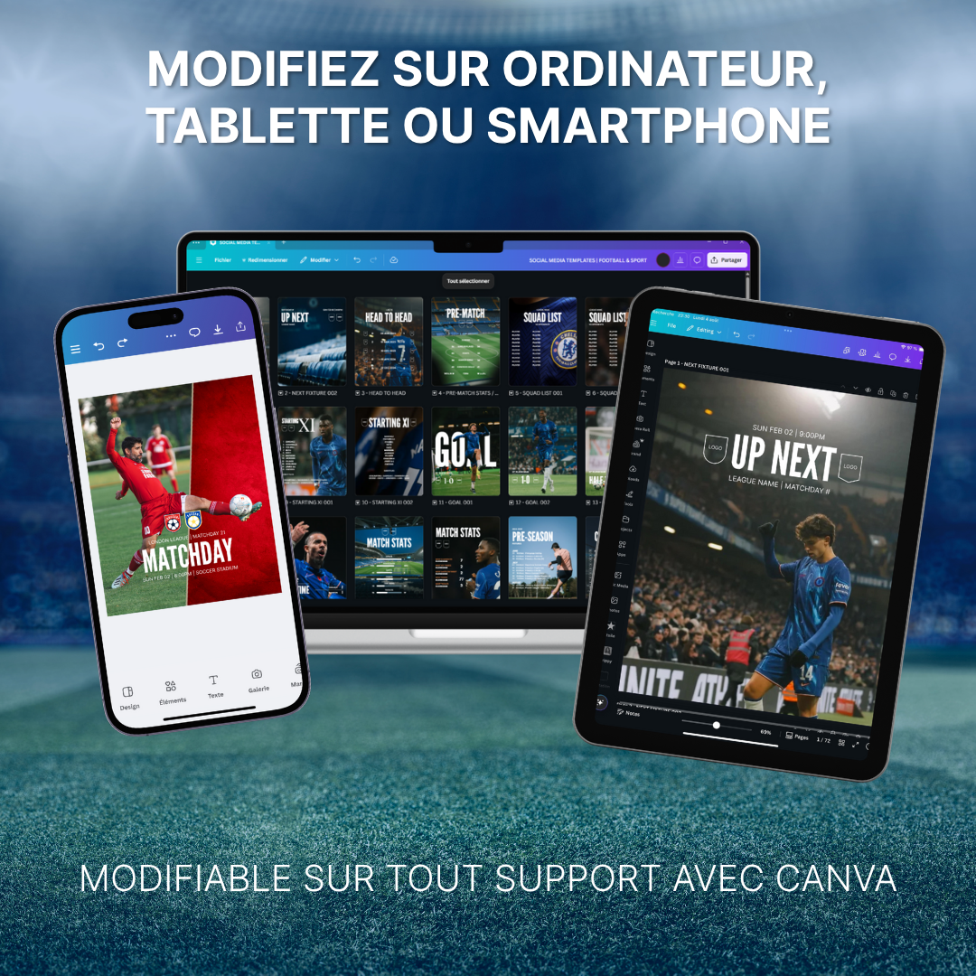 L'utilisation de ces templates ne nécessite aucune compétence en conception graphique. Canva vous offre une aisance de travail sans pareil : votre visuel peut être modifié depuis un ordinateur, un smartphone ou une tablette, et être partagé rapidement sur vos réseaux sociaux. Vos supporters absents connaitront le score du match à peine le coup de sifflet final donné !