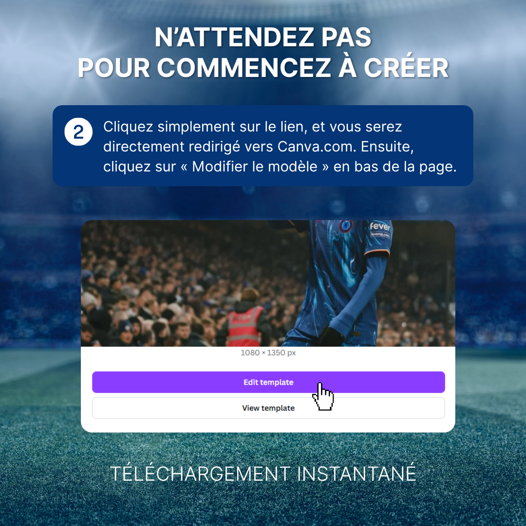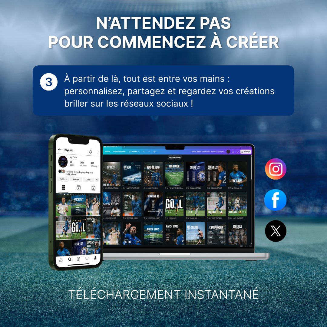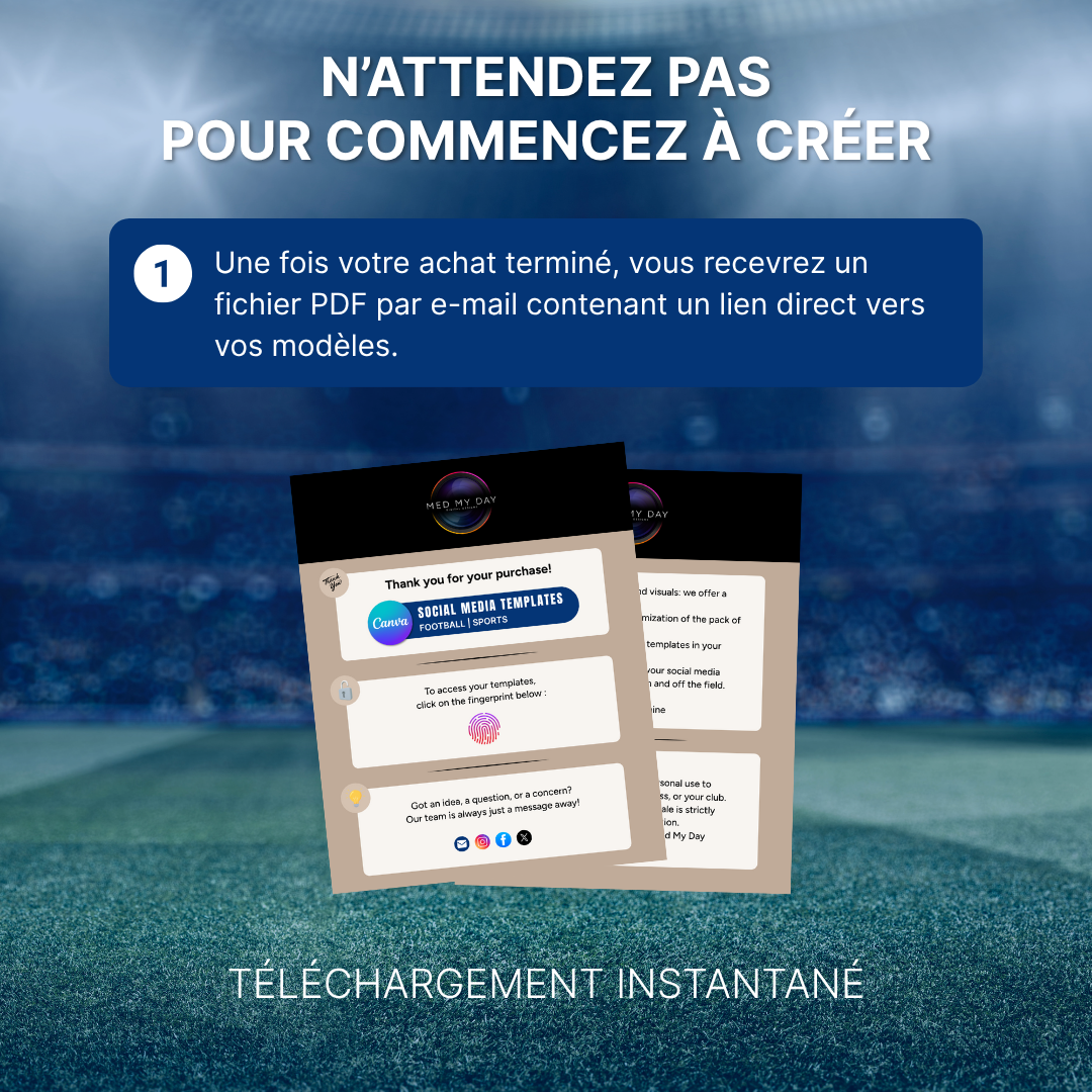 Une fois votre achat finalisé, nos templates sont téléchargeables et utilisables immédiatement. Vous recevrez instantanément un fichier PDF contenant le lien vers vos templates. Pas d'attente, pas de frais d'expédition. N'attendez pas un seul instant pour créer du contenu attractif et améliorer la vie sociale de votre club !