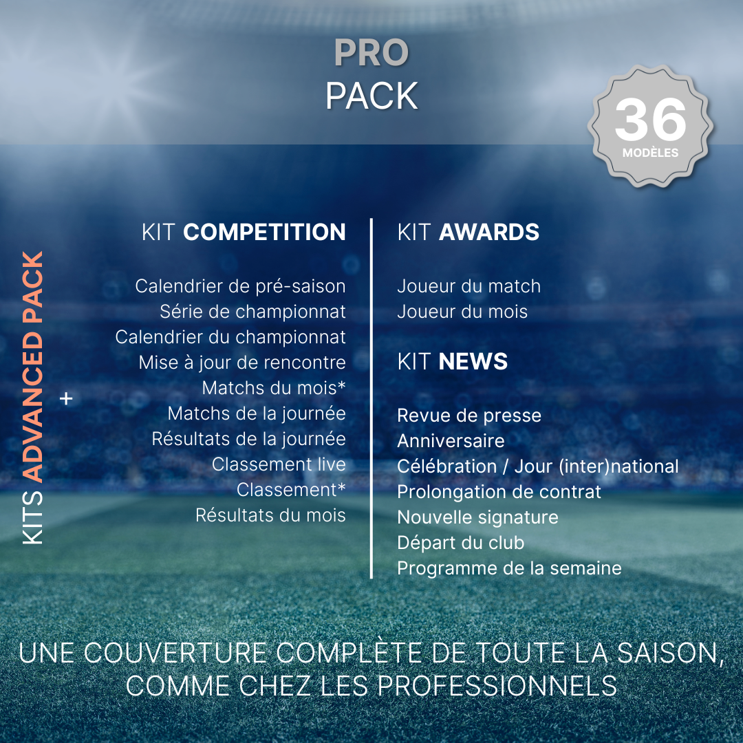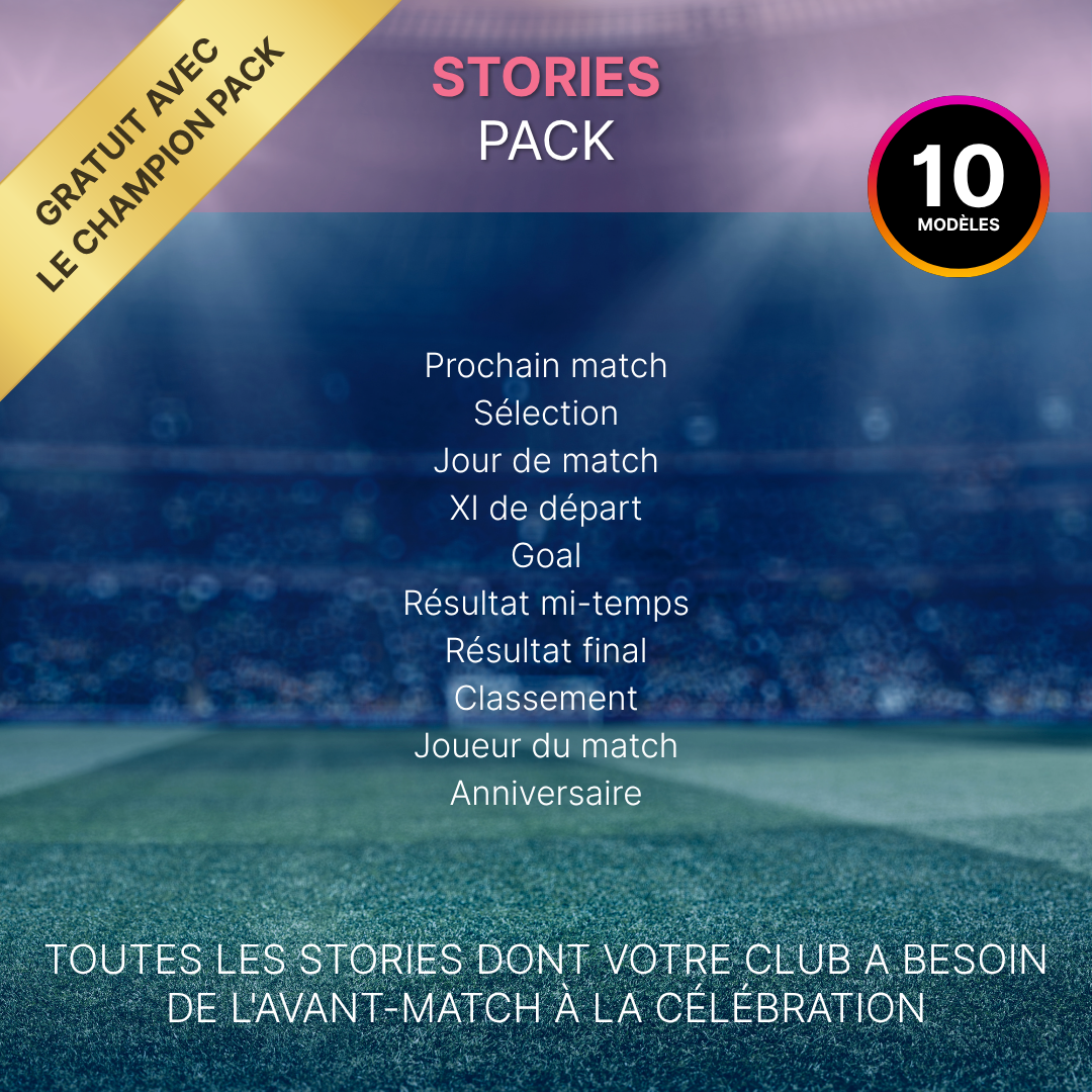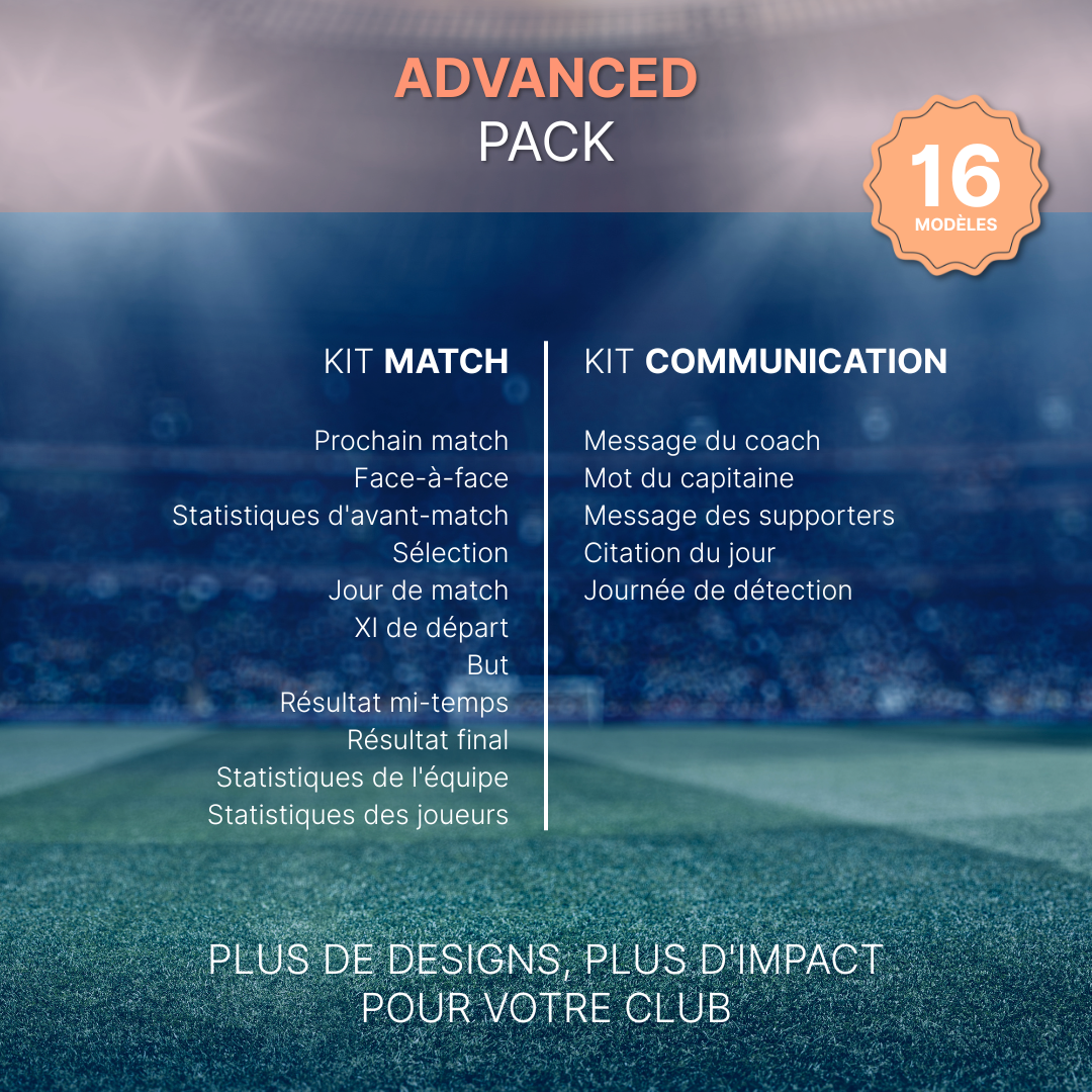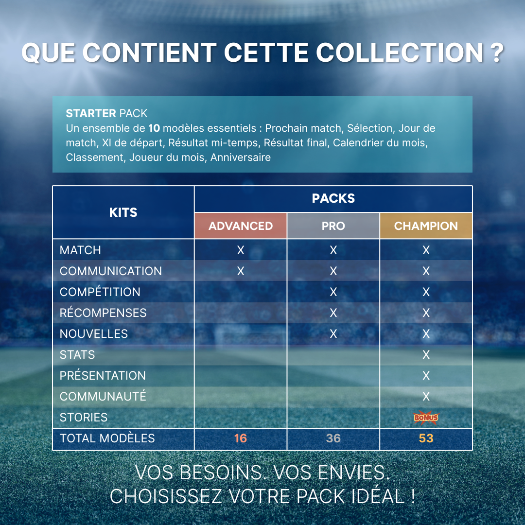 ✔️ Un mix de 10 templates comprenant : Prochain match, Sélection, Jour de match, 11 de départ, Goal, Résultat mi-temps, Résultat fin du match, Classement, Joueur du match et Anniversaire.