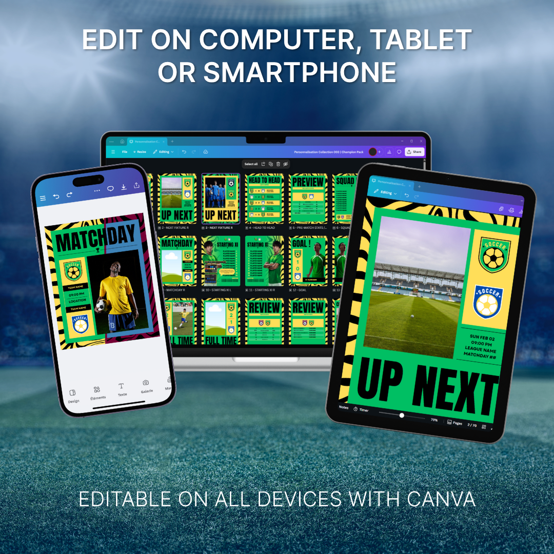 L'utilisation de ces templates ne nécessite aucune compétence en conception graphique. Canva vous offre une aisance de travail sans pareil : votre visuel peut être modifié depuis un ordinateur, un smartphone ou une tablette, et être partagé rapidement sur vos réseaux sociaux. Vos supporters absents connaitront le score du match à peine le coup de sifflet final donné !